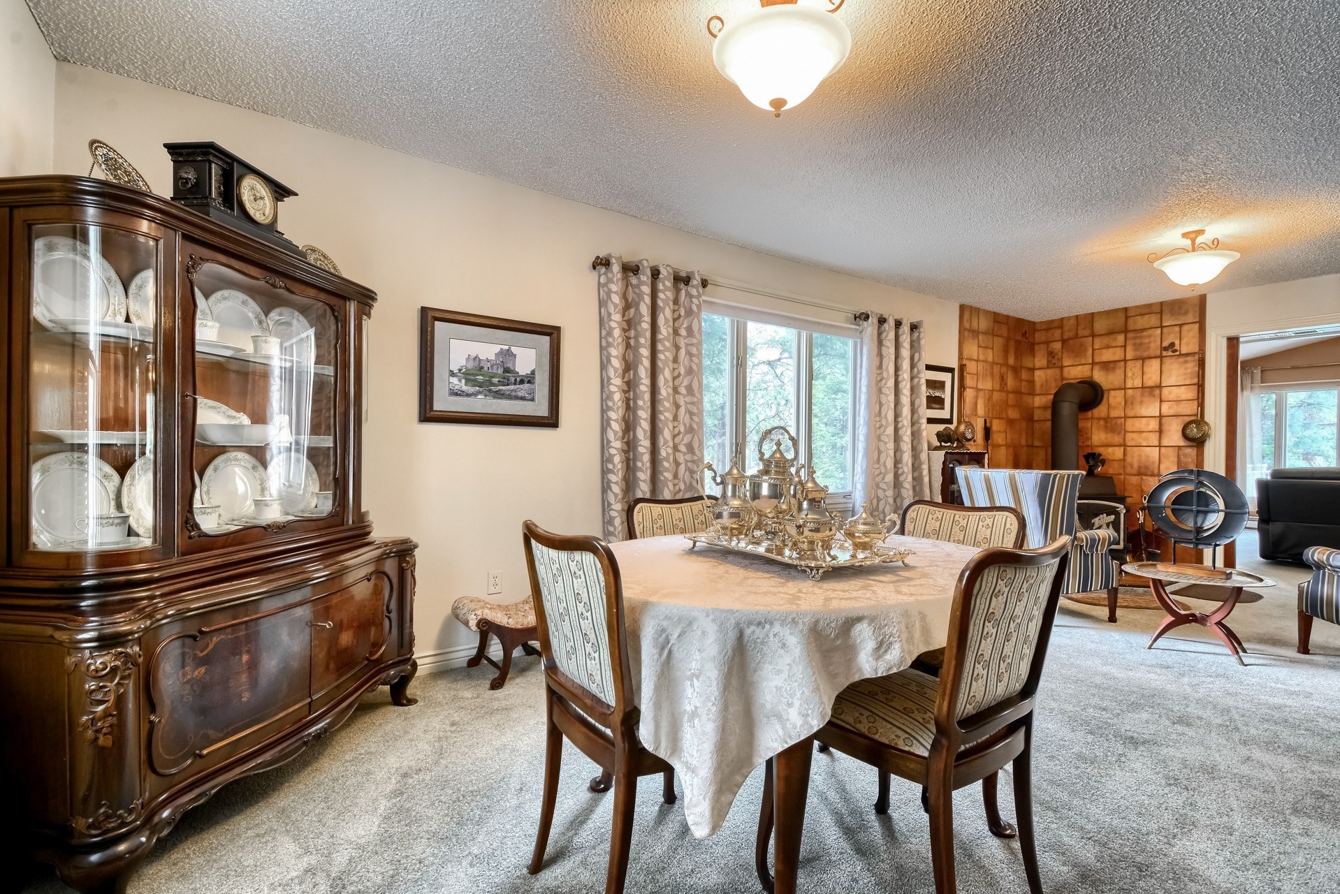 This Gorgeous Home has a Covered Front Deck that invites you in to a Welcoming Foyer and a Stunning Bright Living Room that's Vaulted with a Wood Beam accent and a Wall of Windows. There's an adjacent Spacious Dining and Sitting Room with a Wood Burning Stove and a nearby Dry Bar with Slab Granite and Cabinetry. The Family Room, also Vaulted, has a Gas Fireplace offering a Mantel and Hearth, perfect for those chilly evenings, and has a Slider Access to the Expansive Back Composite Deck; Perfect for Entertaining and Relaxing in your Private Backyard with Majestic Pine Trees while enjoying the Wildlife. Step up a few stairs to a Sunny Sitting Room with Bay Windows, also Ideal as a Breakfast Nook.